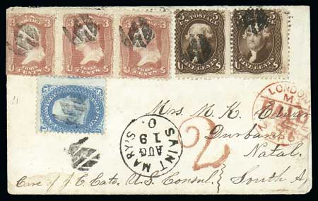 1 cent, 3 cent and 5 Cent, Scott No. 95, August 19, 1868 to Natal, South Africa