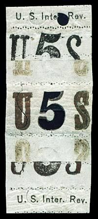 The only block which we have noted was an O.G. block of 4 sold in the Hind Sale. The stamp is known on patriotic cover but it is a scarce item so used. The stamp has been found with a double transfer of the top frame line, the bottom frame line, and both top and bottom frame lines, and since it was printed from the same plate that printed the 5 cent buff stamps, it is possible that the same double transfer may yet be noted on the 5 cent buff.